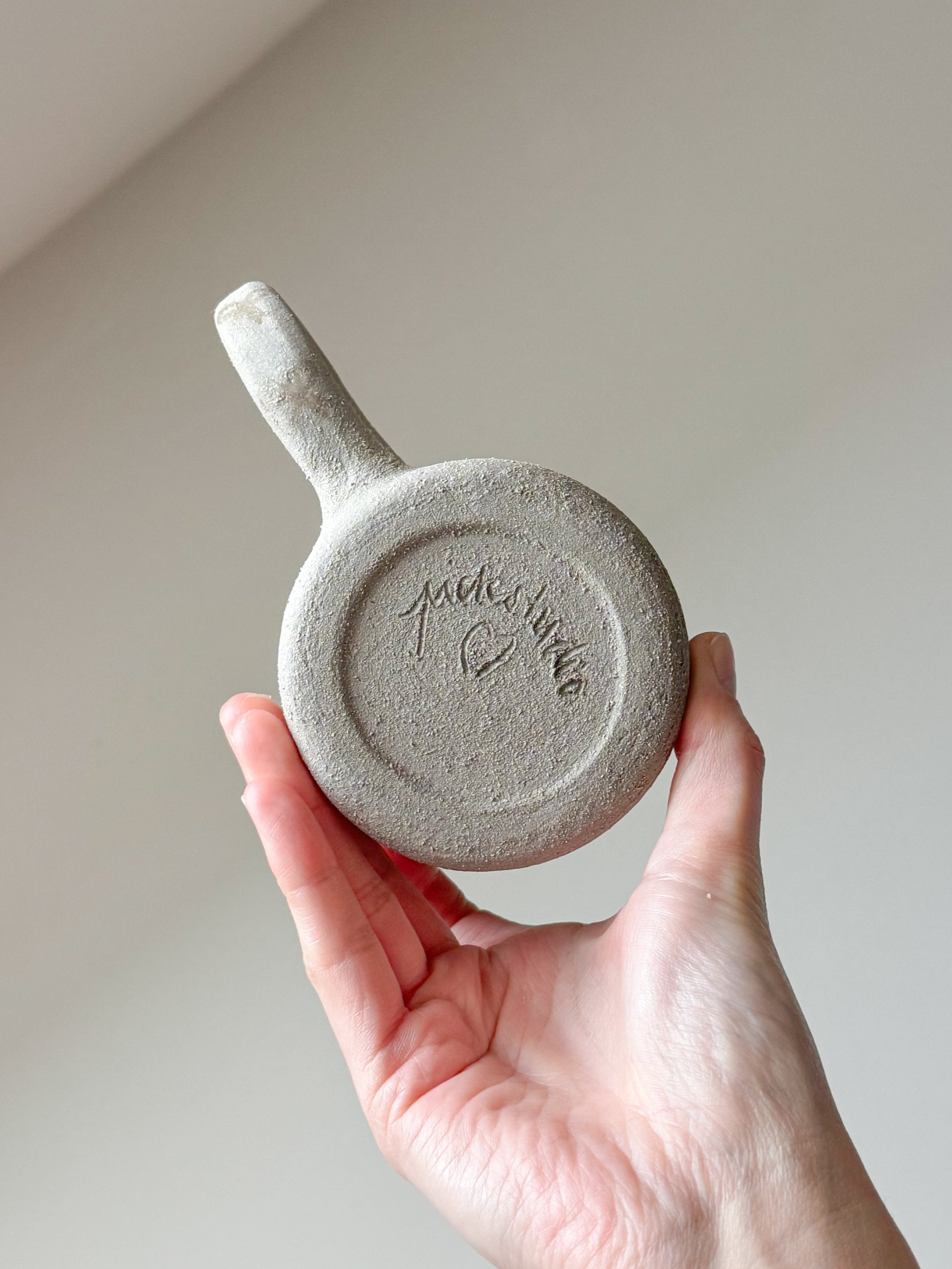 La terre utilisée pour fabriquer ces tasses est chamottée ce qui signifie que la tasse est texturée. La terre est émaillée à certains endroits pour créer des motifs mais reste brut sur le reste de la tasse. Cette texture peut déranger les personnes sensibles au touché.